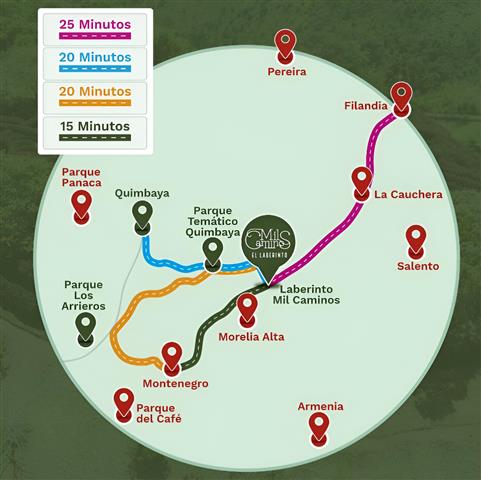 Laberinto Mil Caminos se encuentra a menos de 20 minutos de Filandia, Montenegro y Quimbaya, en un punto equidistante entre los tres municipios
